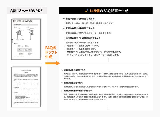 本機能の自社テストでは、2つのPDF(18ページ)から合計145個のFAQ記事が自動生成され、そのうち誤った情報を含む記事は1個のみという正確性の高い記事生成を実現しています。本機能により、規約、マニュアル、営業資料、IR資料をはじめとしたPDFコンテンツをすばやく、正確にFAQ化することが可能になりました。これにより初期構築にかかる工数を削減し、企業や行政におけるカスタマーサポート業務の効率化を支援いたします。