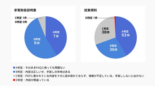 本機能の事前テストとして、独自に用意した「家電取扱説明書(4ページ)」および「就業規則(14ページ)」を用いて実験し、生成されたFAQ記事を「Helpfeel」のFAQ記事を担当するテクニカルライターが厳しい基準で評価を行いました。