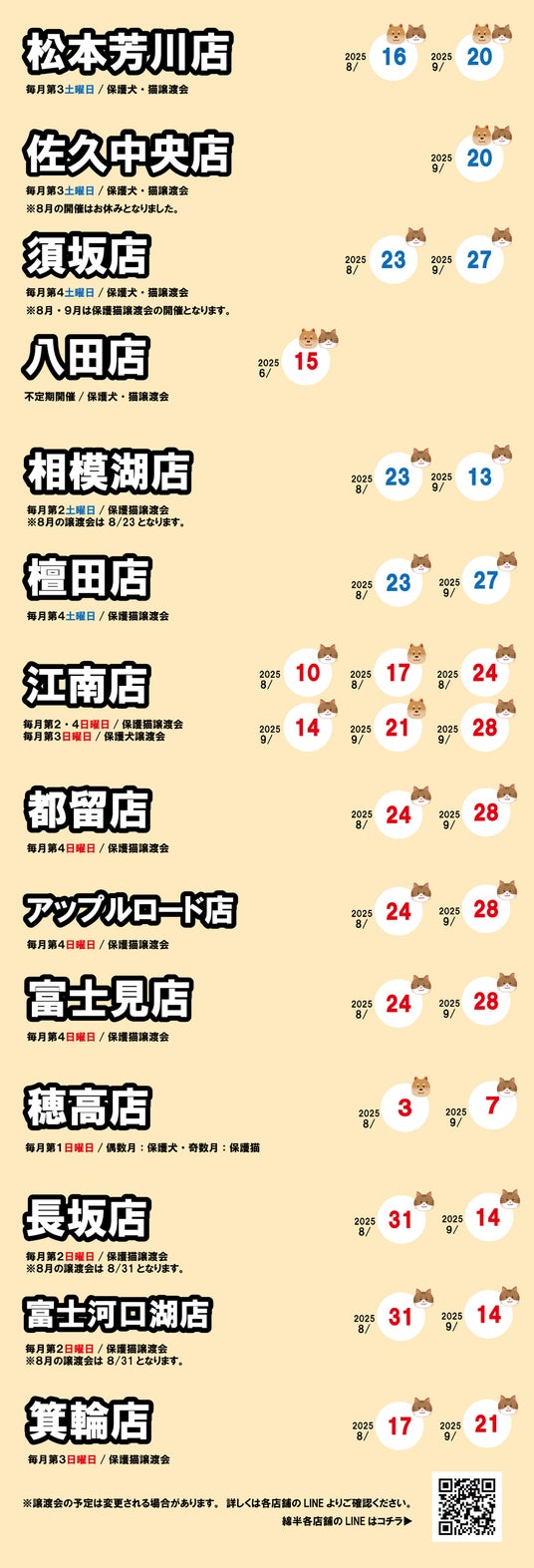 綿半パートナーズ株式会社(長野県飯田市 代表取締役社長:野原佳代子)はこの度、長野・山梨・愛知・神奈川の綿半店舗にて保護犬・保護猫の譲渡会を実施します。