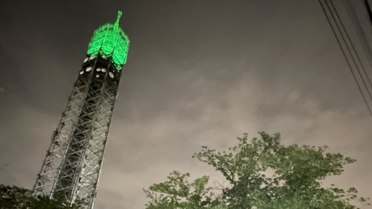 ▲夜間のライトアップにより翌日の天気(曇り)を緑色で伝えるスカイタワー西東京(通称:田無タワー)