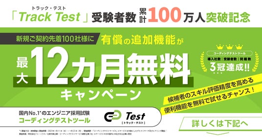 そしてこの度、6月16日に受験者数100万人を突破。累計100万件以上もの採用選考において Track Test をご活用いただきました。今後も、企業の採用力強化や、候補者および組織内のスキル可視化を支援するプラットフォームとして、機能拡充とサービス向上に努めてまいります。