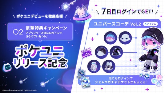 ココネ株式会社(以下「ココネ」)は、新たなアバターアプリ『ポケコロユニバース』(以下「ポケユニ」)を2025年夏にリリースすることを発表します。またリリースに先駆けて7月1日(火)より『ポケユニ』のティザーサイトと公式SNSを公開し、事前登録キャンペーンとそれを記念したSNSキャンペーンを順次開催します。