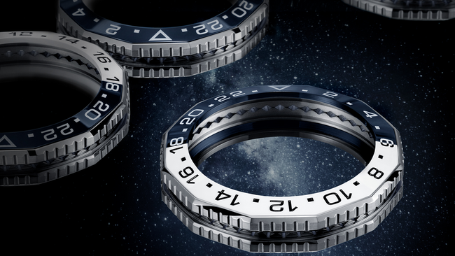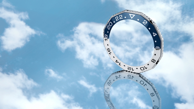 さらに、傷に強いセラミック製の2トーン双方向回転ベゼルを採用し、これは昼と夜の区別をつけるために2色で構成されています。半分はダイヤルにマッチした深いミッドナイトブルーで夕方6時から朝6時までのナイトタイムを、もう半分は鮮やかなホワイトで朝6時から夕方6時までのデイタイムを示しています。
