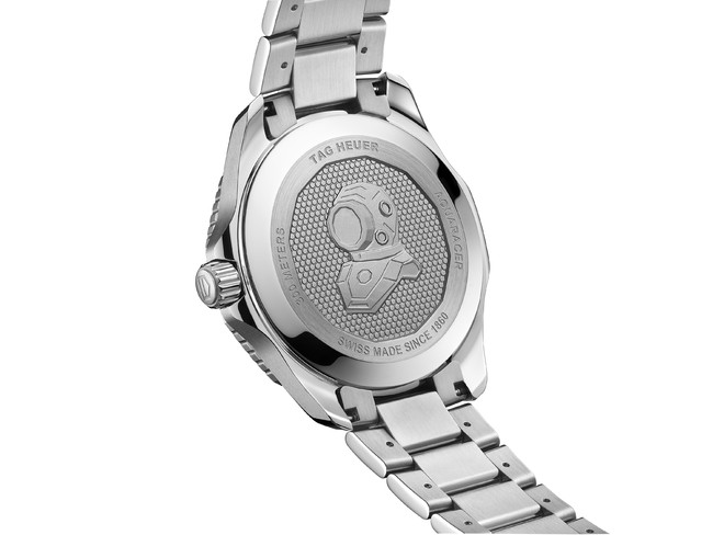タグ・ホイヤー アクアレーサー プロフェッショナル300のコアモデルと同様、この新作のケースバックはステンレススティール製で、6角形を連ねたモチーフと、2004年にタグ・ホイヤー アクアレーサーのケースに初めて登場したダイビングスーツの刻印があしらわれています。さらに、ディテールを徹底的にこだわった新しいタグ・ホイヤー アクアレーサー プロフェッショナル シリーズのケースバックはダイバーモチーフが正面を向くように設計されています。