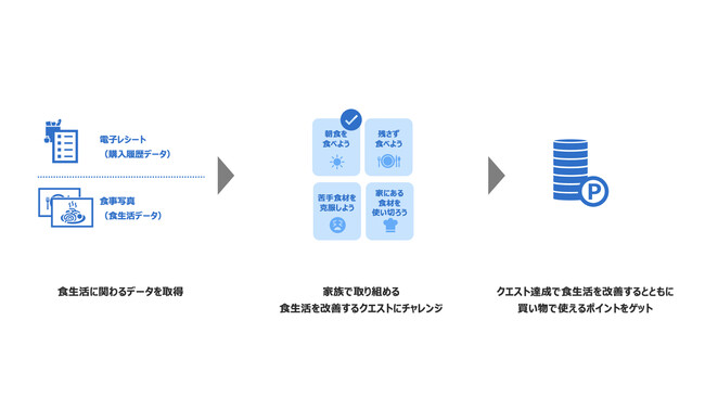 うちれぴアプリには、電子レシートサービス「スマートレシート(R)」(注4)を介して、スーパーマーケット「ユニバース」での購入履歴が自動連携され、また、モニターも食生活データ(食事を食べ切った後の食卓の写真、など)を自ら登録していきます。このようにして蓄積された購入履歴と食生活データ、そして事前登録された苦手食材データを基に、うちれぴアプリは、モニターとその家族の食生活の改善と食品ロスの削減を促す行動(朝食を食べる、苦手食材を利用したレシピを作る、ご飯を残さず食べる、など)の提案である「クエスト」を提示します。また、店舗で発生する食品ロスを削減するために、過剰在庫が発生した食材の購入を提案するクエストも提示します。