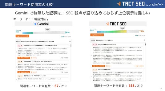 汎用AIに単に指示を出すだけではSEOに必要なキーワードが不足しがちですが、『TACT SEO』は上位ページの要件を自動で分析して記事を生成するため、本文中の重要キーワードの含有率が通常のAIの倍近くに達します。