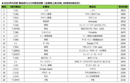 ■2024年5月度 商品別テレビCM放送回数ランキング