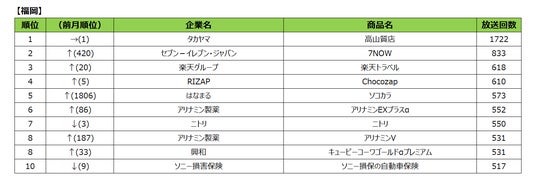 地域別ランキングは各地域の上位が異なる混戦となりました。東京地区1位は、資産運用アプリのウェルスナビ「ウェルスナビ」、大阪地区1位はユー・エス・ジェイ「ユニバーサル・スタジオ・ジャパン」、名古屋地区1位はニトリ「ニトリ」、福岡地区1位はタカヤマ「高山質店」、札幌地区1位はリクルートホールディングス「スーモカウンター」と地域ごとの特色が見られる結果となりました。