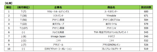 ■2024年5月度 エリア別テレビCM放送回数ランキング(※札幌地区にて受信障害が発生したため、札幌地区のランキングに一部変動があります。)