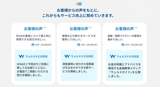 ※19 2024年7月15日に実施したアンケートでの質問「ウェルスナビを利用してよかったことがありましたら教えてください。」に対する回答より。個人の投資体験談であり、将来の運用成果等を示唆または保証するものではありません。投資に関する決定は、お客様ご自身のご判断と責任のもとに行っていただきますようお願いいたします。
