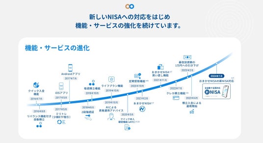 NISA(少額投資非課税制度)の非課税メリットを活用しながら資産運用が行える「おまかせNISA」、資産運用の目標達成をサポートする「ライフプラン」、少額でも最適なポートフォリオを実現する「ミリトレ(少額ETF取引機能)」など多彩な機能で、お客様の快適な資産運用を応援します。「リバランス機能付き自動積立」、「自動税金最適化(DeTAX)機能※」は、中核となる技術について特許を取得しています。