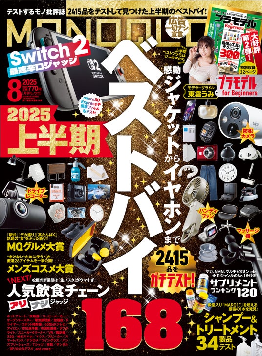 8月号は「2025上半期ベストバイ168」を総力特集! 感動ジャケットからイヤホンまで2415製品をガチ検証して見つけた、神アイテムを紹介します。他にも、「シャンプー&トリートメント2025最新製品No.1決定戦」や「サプリメント最強ランキング120」も掲載。大人気の「プラモデル for Beginners」の第2弾も特別収録しちゃいました。8月号も暮らしをアップデートする情報を厳選してお届けします。