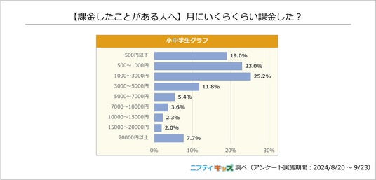 ゲームへの課金経験者の月額課金額は、「1,000~3,000円」が25.2%と最も多く、次いで「500~1,000円」が23%、「500円以下」が19%でした。一方で、5,000円以上の課金したことがある人の割合を合わせると21%で、その中でも20,000円以上の課金をしたことがある人は7.7%と一部の子どもたちが高額課金をしたことがあることがわかりました。
