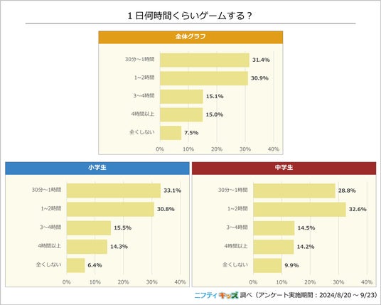 1日のゲーム時間は小学生では「30分~1時間」、中学生では「1~2時間」が最多でした。「全くしない」人の割合は、小学生の6.4%から中学生は9.9%に増えていますが、90%以上の小中学生が毎日ゲームをしていることがわかりました。