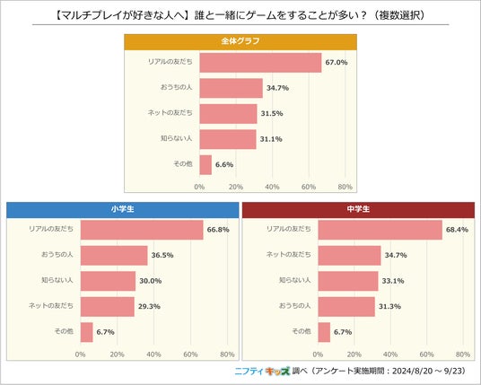 マルチプレイでの相手は、「リアルの友だち」が最も多い結果となりました。小中学生ともに傾向は似ていますが、小学生では「おうちの人」、中学生では「ネットの友だち」が2位と、中学生になるとネットの友だちとの交流がやや増加することがわかりました。