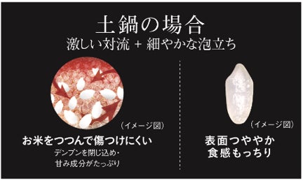 土鍋の泡でお米を包み込んで炊きあげることで、お米の表面を傷つけにくく、ごはんのハリとつやを保ち、粒立ちが一層に際立ちます。ごはんの旨みやふくよかな風味、食感を損なうことなく、一流料亭のようにつややかで 粒立ちの良い理想のごはんを炊きあげることがことができます。