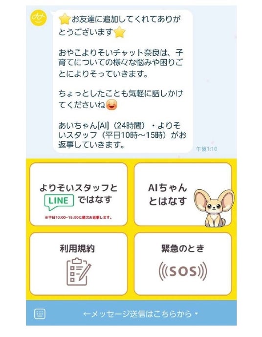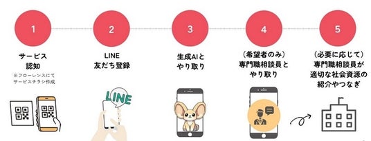 - 生成AI「AI(あい)ちゃん」が24時間365日、LINEで相談にのることで気持ちの傾聴・課題整理を行います。