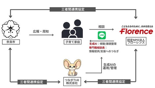 奈良市は生成AIによる24時間365日対応と専門職員の有人相談による「AIと人のハイブリッド子育て相談」の実証実験を5月13日から開始します。この取り組みにおいて、認定NPO法人フローレンスおよびつながりAI株式会社と奈良市が三者連携協定を締結します。