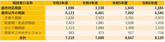 奈良市子どもセンターに寄せられる虐待対応相談件数は、令和4年度1,238件、令和5年度1,645件、令和6年度1,584件と、増加傾向にあります。また、虐待以外の相談件数(子どもセンターの虐待以外の相談、母子保健相談、ひとり親相談、奈良すこやかテレフォン)は、令和4年度6,461件、令和5年度7,002件、令和6年度6,545件と、少子化により子どもの出生数が減少している中で、相談件数は増加傾向にあります。