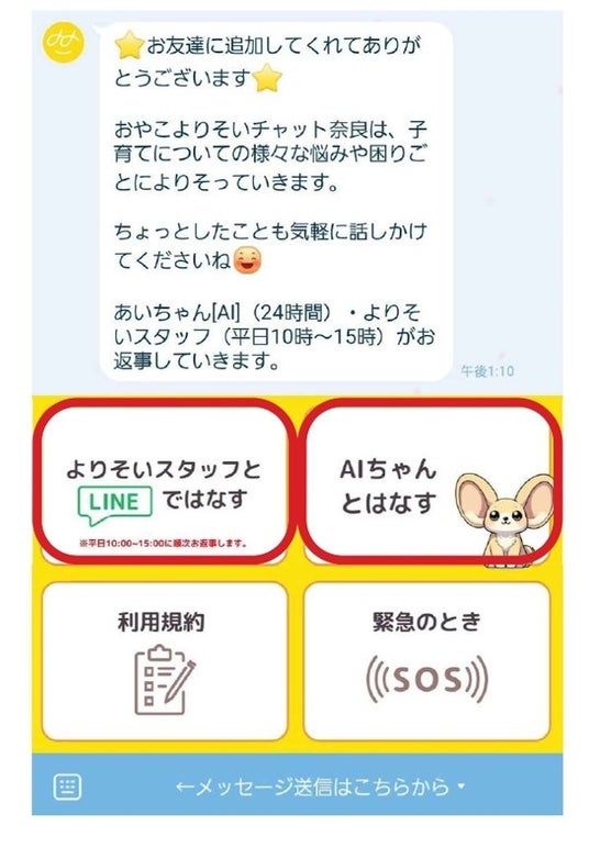 奈良市の相談窓口の対応時間は日中に限られている現状があり、就業時間や育児の時間以外でスマホを手にすることができる時間帯(休日や夜間等)に利用でき、匿名性があって、相談者の都合の良い時間(24時間・365日)に対応可能なAIの強みを生かした相談を試行的に導入します。