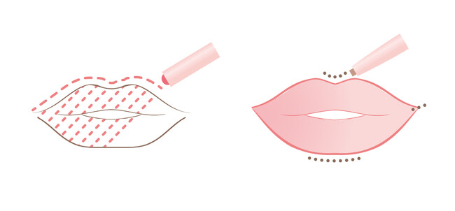 Step 1:粘膜拡張ペンシルで理想のオーバーリップの形に唇を縁どり、内側を塗りつぶします。唇の山をM字になるように描くと人中短縮効果に。