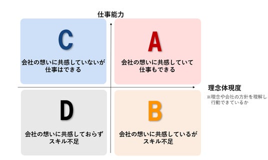 一般的に企業は、Bのような「伸びしろのある人材」に教育リソースを投下しがちです。また、Cのような「スキルはあるが理念に共感しない人材」には、どのように組織に馴染ませるかが課題となります。そしてDは、いずれ入れ替えが必要な存在として認識されるでしょう。