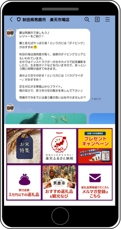 この「男鹿市ふるさと納税LINE公式アカウント」では、男鹿市のふるさと納税返礼品情報を同市の四季に合わせた特産品や観光などの情報と共に発信し、同市に興味を持つ方に対し認知拡大とコミュニケーションの構築、新たなファンの獲得や醸成に繋げていくことを目的としています。またこの度、秋田県を中心に降り続いた豪雨による被害の支援募集についても情報発信を行いました。公式アカウントではこのように、適時に同市と同市を愛するファンを繋げていく役割も担っていきたいと考えています。