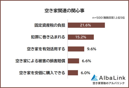 「空き家関連の関心事」で最も多かった回答は、「固定資産税の負担(21.6%)」、2位は「犯罪に巻き込まれる(15.2%)」でした。以下、3位「空き家を有効活用する(9.6%)」、4位「空き家による被害の損害賠償(6.6%)」、5位「空き家を安価に購入できる(6.0%)」でした。