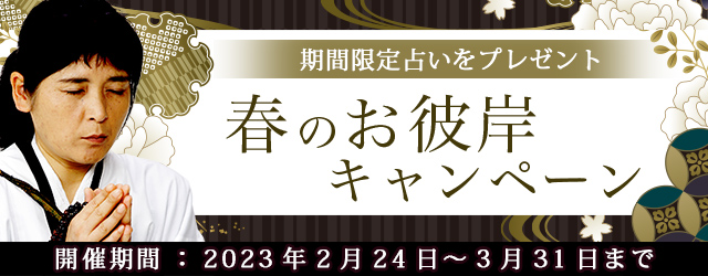 松田広子の公式占いサイト「恐山の秘術【最後のイタコ】松田広子」では、『春のお彼岸キャンペーン』を開催中です。本キャンペーンでは期間中、対象の鑑定を占っていただいた方に、「春のお彼岸特別鑑定」をプレゼントいたします。特別鑑定は、あなたの運命について更に詳しくお伝えできる鑑定となっております。期間限定のキャンペーンとなっておりますので、皆様この機会に是非ご参加ください。