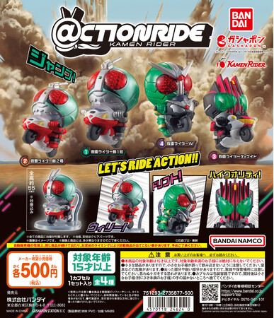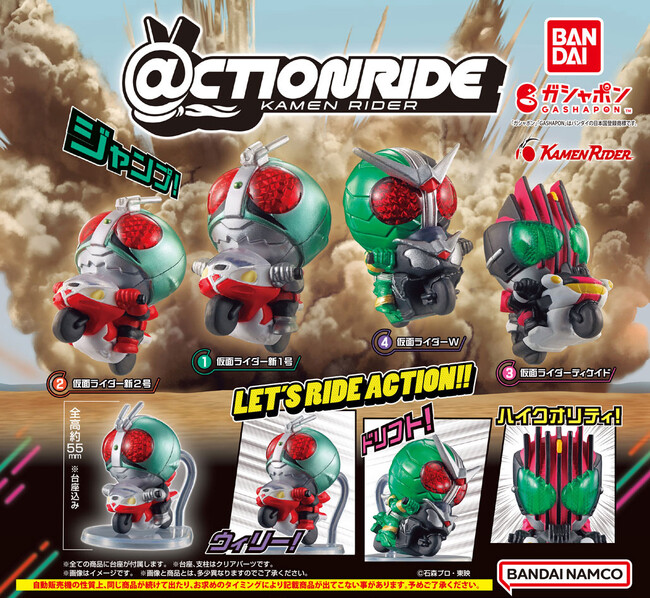 株式会社バンダイ ベンダー事業部(本社:東京都台東区)は、仮面ライダーのコレクションフィギュア『@CTION RIDE(アクションライド) 仮面ライダー』(1回 500 円・税10%込、全4種)を2024年9月第3週から順次、全国のガシャポンバンダイオフィシャルショップ、玩具売り場・量販店・家電店などに設置されたガシャポン自販機シリーズにて発売いたします。