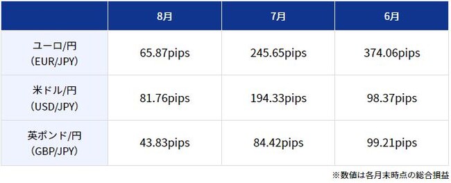 6~8月の3か月間においては、ユーロ/円と米ドル/円、英ポンド/円は好調を維持したといえるでしょう。8月のプラス幅は6~7月より減ったものの、この3通貨に注目しているユーザーも多いのではないでしょうか。