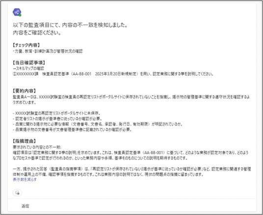 システムは、Copilot StudioをベースにAzure OpenAI Service(GPT-4.1)を活用し、Microsoft SharePoint上の監査データと連携。Microsoft TeamsやMicrosoft Power Automate(以下、Power Automate)とも統合することで、シームレスな業務フローを実現しています。
