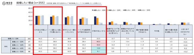 「結婚することで社会的信用が上がると思うから」「結婚はするものであると思っているから」など、社会的圧力や固定観念を結婚の理由とする様子も一定の割合でみられましたが、全体のトップとなったのは「心の支えが欲しいから」。そこに次いで「一人暮らしに寂しさを感じるから」が票を集めました。「子供がほしいから」結婚したいと考える割合は、20代で40.3%となっており、43.3%の「心の支えが欲しいから」という理由と同程度の位置付けであることがわかります。30代から40代にかけては「子供がほしいから」という理由よりも、「一人では経済的な不安があるから」という理由に徐々に意識が向けられていく様子もみられました。