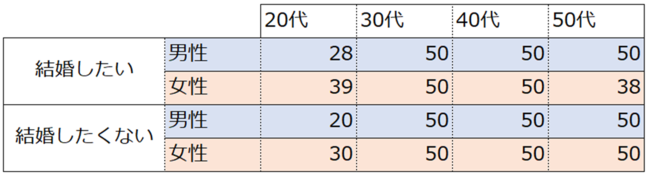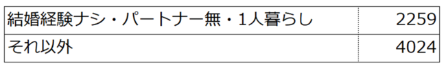 ・スクリーニング調査:全国の20歳以上59歳以下の男女・本調査:結婚経験が無く・現在付き合っているパートナーがおらず・一人暮らしをしている人3.割付・有効回答数