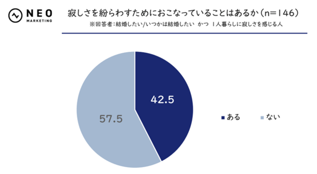 「ある」と回答した人の割合は1.で42.5%、2.で41.2%と、両者に大きな違いはみられませんでした。結婚願望の有無にかかわらず、一人暮らしをしていて寂しさを感じる人は、回避する何かしらの行動をとっている人が多いようです。趣味に没頭する、インターネット上のコミュニティに参加するなど、さまざまな回避行動が考えられそうです。