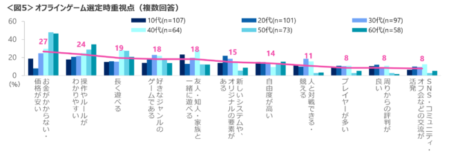 オフラインゲームを選ぶ理由は、「お金がかからない・価格が安い」が最も高く、次いで「操作やルールがわかりやすい」「長く遊べる」「好きなジャンル」「友人・知人・家族と一緒に遊べる」など。60代は「お金がかからない・価格が安い」「操作やルールがわかりやすい」、40代は「友人・知人・家族と一緒に遊べる」の理由が目立った。<図5>