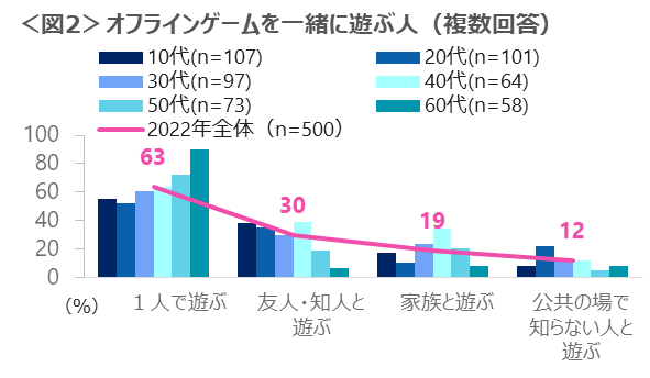 オフラインゲームを一緒に遊ぶ人は、「一人」が63%と最も多く、次いで「友人・知人」の30%である。「一人」で遊ぶ人は、年齢が上がるほど多くなり、60代は突出している。また、40代は「家族」と遊ぶ人も多い。<図2>