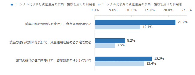 また、該当の銀行から資産運用の案内を受けたことがある利用者を対象に、案内を受けての資産運用の検討状況を調査しました。その結果、パーソナル化された資産運用の案内を受けた利用者は、実際に資産運用を始めた割合が21.9%となり、パーソナル化されていない資産運用の案内を受けた利用者よりも割合が高くなりました。資産運用を始める予定である利用者と資産運用を検討している利用者の割合についても、パーソナル化されていない資産運用の案内を受けた利用者に比べて高くなりました。利用者の口座状況や取引状況に基づいた、利用者それぞれに合わせた案内をすることで、資産運用をはじめるきっかけにつながるなど、パーソナル化の重要性が示唆される結果となりました。
