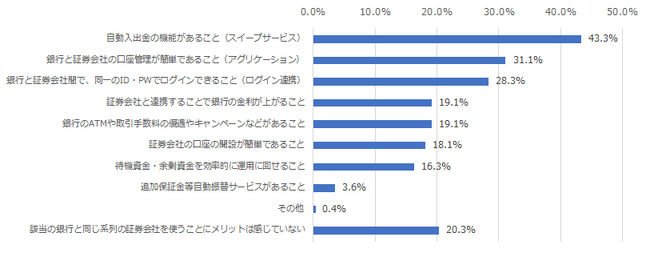 これらの利用者に対し、系列の証券会社で資産運用することのメリットを調査したところ、最も高くなったのは「自動入出金の機能があること(スイープサービス)」(43.3%)となり、次いで「銀行と証券会社の口座管理が簡単であること(アグリケーション)」(31.1%)、「銀行と証券会社間で、同一のID・PWでログインできること(ログイン連携)」(28.3%)が続きました。