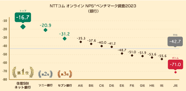 対象の銀行13行のうち、NPSのトップは住信SBIネット銀行(-16.7ポイント)、2位はソニー銀行(-20.9ポイント)、3位はセブン銀行(-31.2ポイント)となりました。対象13社のNPS平均は-42.7ポイント、またトップ行とボトム行との差は54.3ポイントとなりました。