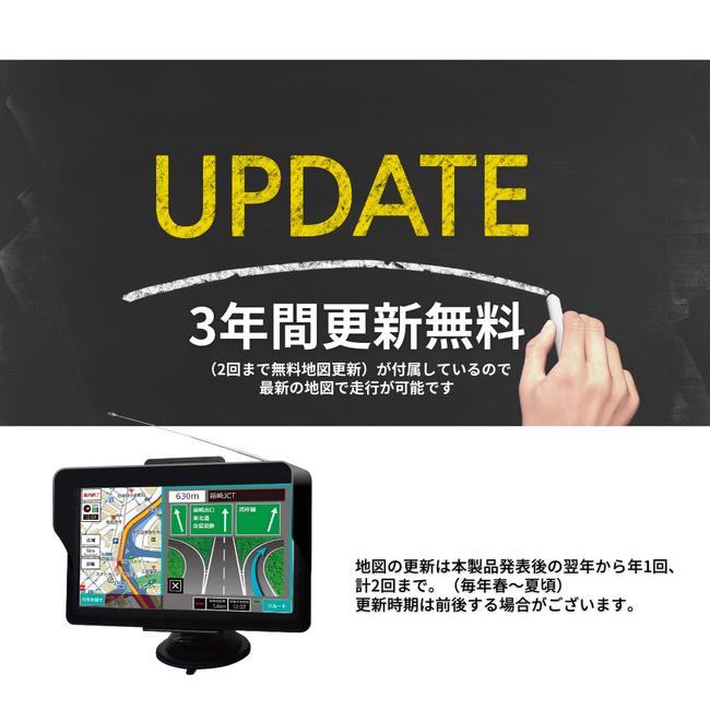 3年間更新無料 (2回まで無料地図更新)が付属しているので最新の地図で走行が可能です。
