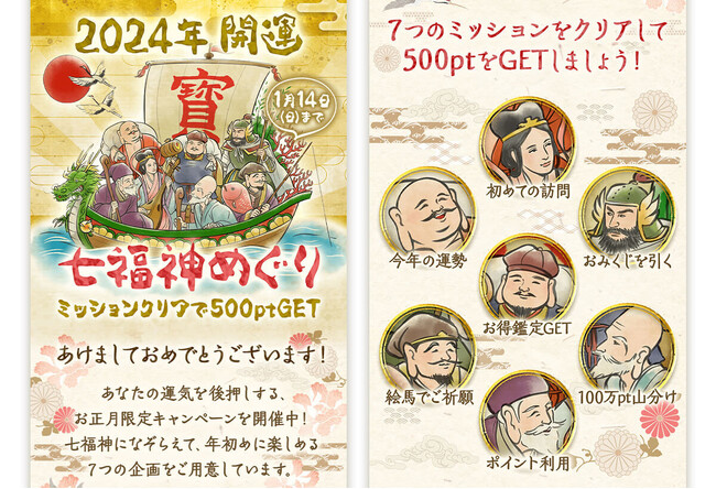 2024年もサイト内の特設ページにて「七福神めぐり」キャンペーンを開催します。7柱(ななはしら)の七福神になぞらえて7つのコンテンツをご用意。
