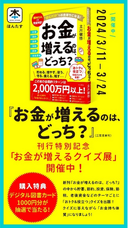 「ほんたす ためいけ 溜池山王メトロピア店」にて『お金が増えるのは、どっち?』をお買い上げいただいた方の中から、抽選で5名様にデジタル図書カード1,000 円分が当たります。応募手順は『お金が増えるのは、どっち?』に封入されている「ほんたす入店&購入特典のご案内」をご参照ください。