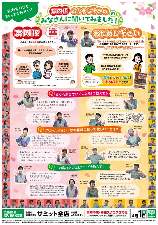 引っ越しにより初めてご利用になるお客様にも、サミットのユニークなサービスを知っていただくことを目的にしました。売場の案内だけに留まらず、お買い物やメニューの相談にものっている「案内係」や、気になる商品を気兼ねなくあれこれ試せる「おためし下さい」を、担当者の写真や直筆メッセージとともに紹介しました。