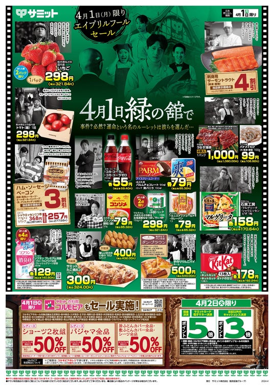 例年エイプリルフールセールでは、映画ポスターをイメージした予告ポスターや動画などを制作し、店頭やホームページ、サミットアプリ上で展開してセールを盛り上げています。今年はそれらに加え、折込チラシでも大きく取り上げました。ミステリー映画風の仕立てで、架空の登場人物に扮したバイヤー達の写真を、商品を連想させるメッセージと共にレイアウトしました。