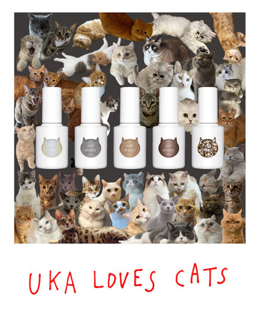 たくさんのお客さまの手元を見続けてきたukaが贈る誰の肌も美しく昇華させるための色の研究。uka study series。uka cat studyは人気のネコをカラーで表現しました。ペルシャホワイト、ロシアンブルーグレー、アメショーベージュ、ミケラメ、uka で初めてのマグネットネイル、キジトラキャッツアイの 5 色。単色でも他の色と合わせてもお楽しみいただけます。