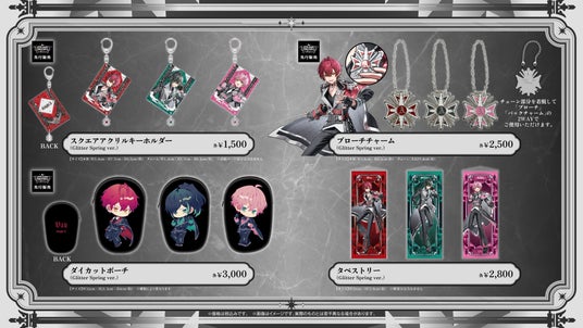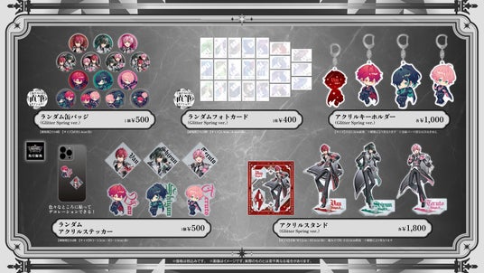 「Glitter Spring」をテーマに春を華やかに彩る新グッズが登場!定番アイテムの缶バッジ、カード、アクリルグッズに加え、新作グッズの「ランダムアクリルステッカー」、「スクエアアクリルキーホルダー」、「ダイカットポーチ」などがラインナップ。