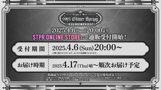 株式会社STPR(本社:東京都渋谷区、代表:柏原真人、以下:STPR)は、STPRが活動をサポートしているビジュアル系2.5次元歌い手グループ「Knight A - 騎士A -」の春グッズ、 Knight A - 騎士A - 2025 Glitter Spring OFFICIAL GOODSを解禁し、4/6(日)20:00より、STPR ONLINE STOREにて受付を開始することをお知らせいたします。