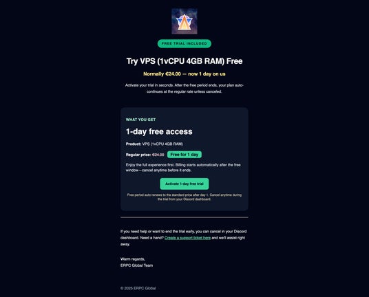 本トライアルは、案内メール内のリンクから有効化することで、VPS(1 vCPU / 4GB RAM)を1日間利用できるものです。対象は既存の ERPC 会員であり、登録済みのメールアドレス宛に配信されています。