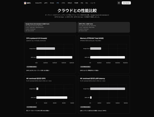 ERPC では、クラウド環境を含む複数の実行環境において、CPU、メモリ、ストレージ I/O、応答特性といった要素を同一条件で比較し、その結果を公開しています。以下は、その一例として掲載している比較資料です。